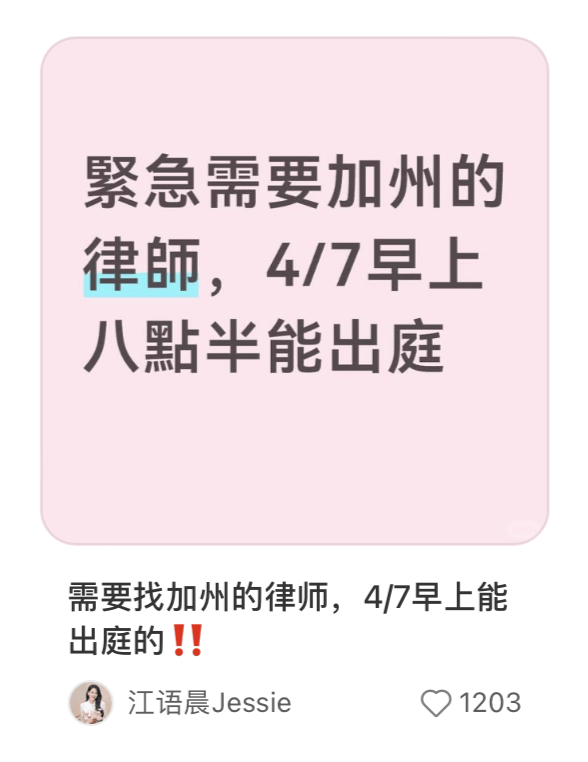 “需要找加州的律师,4/7早上能出庭的‼️ ”
