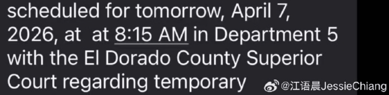 截图显示,听证会定于2026年4月7日上午8点15分,在加州埃尔多拉多县高等法院第5庭开庭,事由涉及“临时相关事宜”。