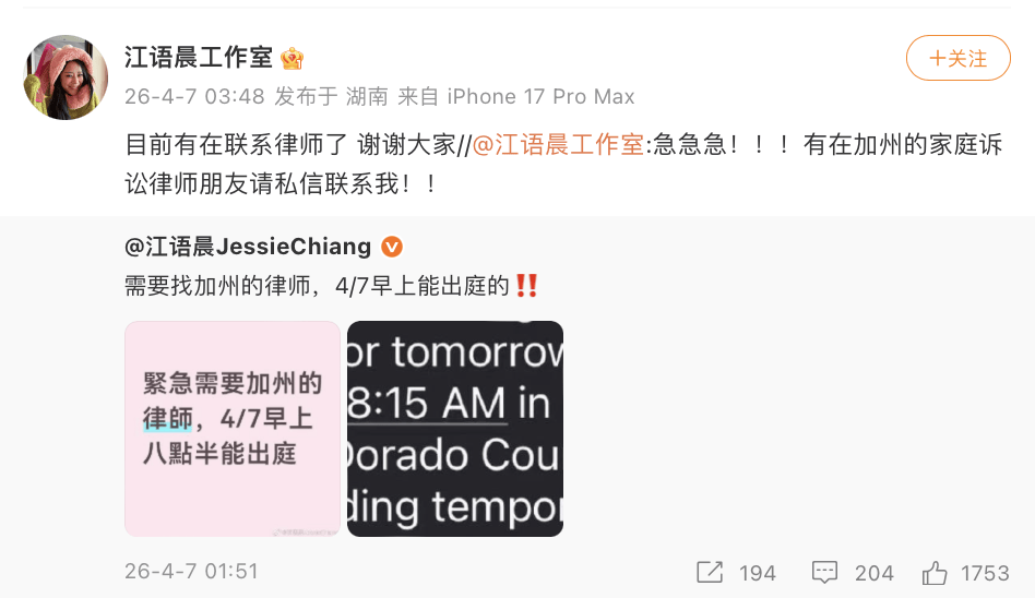 4月7日凌晨1点,刚从《乘风2026》官宣复出的江语晨突然发文求助!“需要找加州的律师,4/7早上能出庭的‼️ ”文章中,还有一张美国法院的排期截图。截图显示,听证会定于20