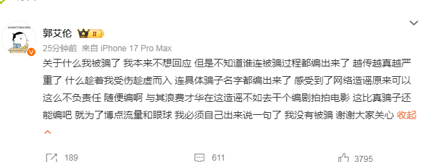 4月7日13:37,郭艾伦在微博发文强调"我没有被骗,谢谢大家关心",表示本不愿回应,但因谣言愈演愈烈被迫发声。他痛斥造谣者虚构"被骗过程、骗子名字"等细节,甚至编造"趁伤病趁虚而入"的情节,直言"网络造谣可以这么不负责任"。