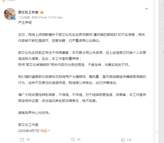 郭艾伦工作室同步发布公告,称网传"遭诈骗巨额钱财"为凭空捏造,已对郭艾伦名誉造成侵害。工作室谴责部分自媒体蹭流量行为,表示将依法追究造谣者法律责任。