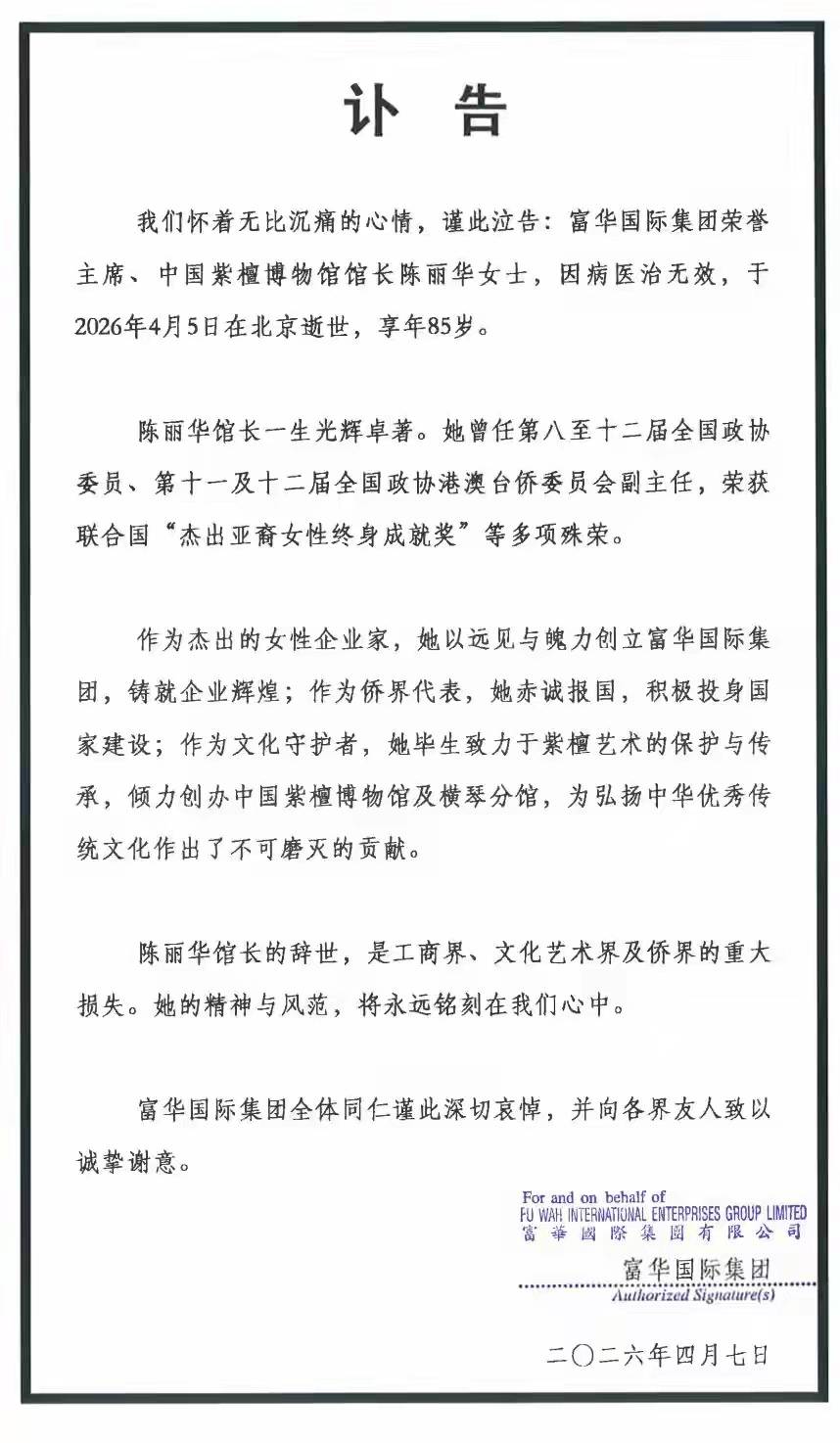 中国女首富陈丽华因病逝世、享年85岁。据公开讣告描述,陈丽华是4月5日清明节当天在北京去世的,其中并没有提及任何有关后事的安排。