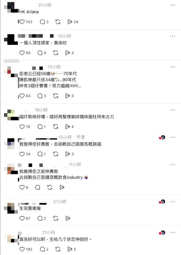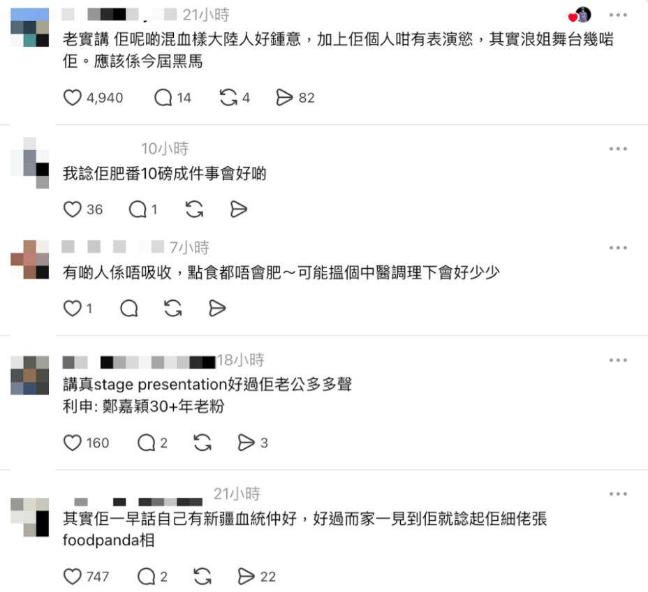 香港网友纷纷留言给与支持:“说实话,她这种混血长相很受内地观众喜欢,加上她本身表演欲很强,其实浪姐的舞台挺适合她的,应该是本届黑马”“舞台表现力比她老公好太多了,声明:我是郑嘉颖三十多年老粉”“原来她会唱歌”“香港版 Ariana”“我觉得她很勇敢,去挑战自己并不擅长的唱跳”“声音很贴麦”“真的很不错,生了几个孩子状态还这么好”。