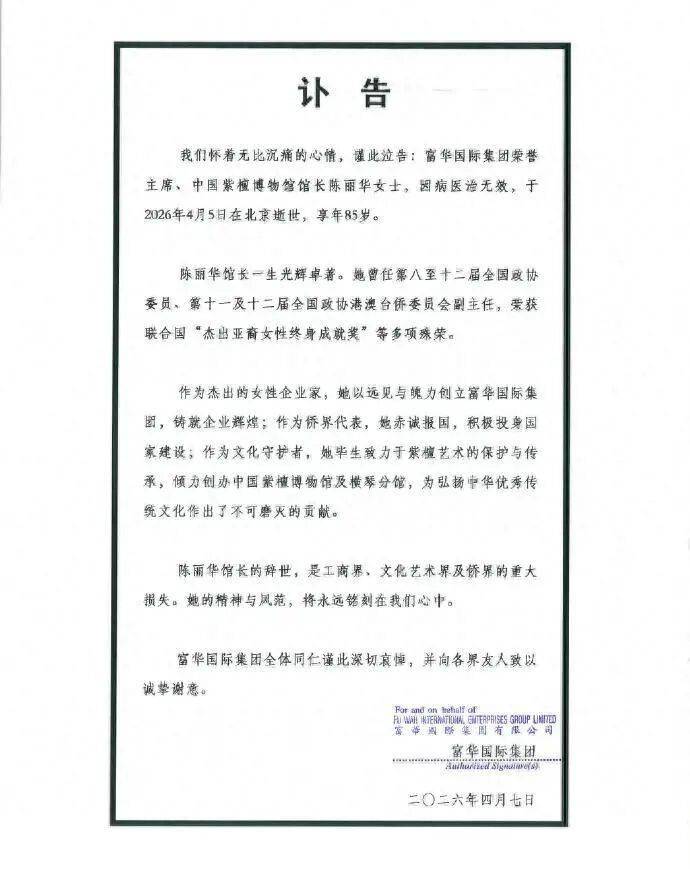 富华国际集团4月7日发布讣告:富华国际集团荣誉主席、中国紫檀博物馆馆长陈丽华女士,因病医治无效,于2026年4月5日在北京逝世,享年85岁。