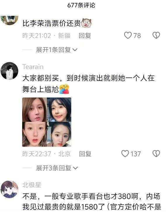她明明不是专业歌手,拿不出一首能称之为“代表作”的歌,可这演唱会的最高票价接近2000元,跟很多一线歌星看齐。
