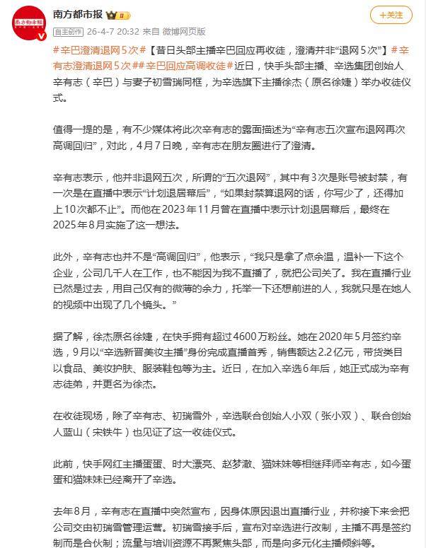 那真正的退居幕后是什么时候?辛巴给出了明确时间线:2023年11月他在直播中透露计划,最终在2025年8月才真正实施,把公司交给了妻子初瑞雪管理。所以在他看来,这次露面根本谈不上什么“高调回归”。