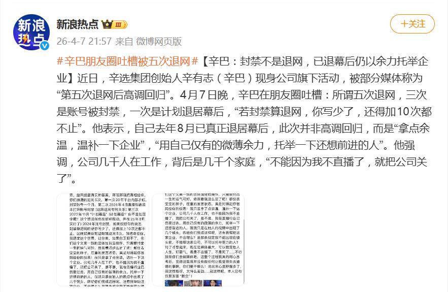 总而言之,这场由朋友圈吐槽引发的“退网”定义之争,不仅澄清了辛巴个人的行动轨迹,也折射出这位昔日直播巨头当前的角色转换——从台前的主角,转变为用“余温”支撑企业、托举新人的幕后掌门人。至于“退网”这个词,以后恐怕得先问问,到底是主动隐退,还是被动封禁了。