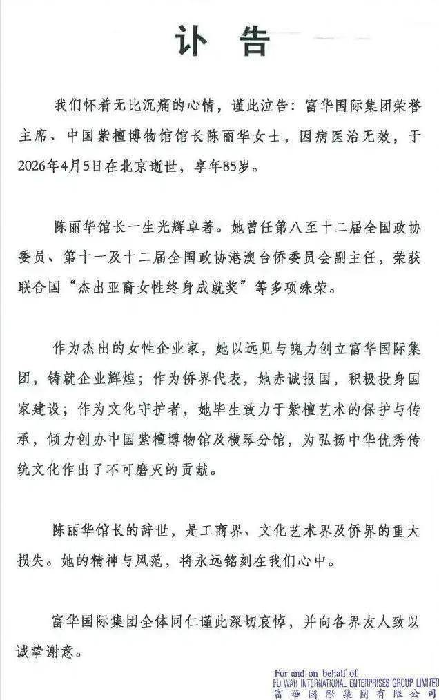 2026年4月5日晚上,陈丽华在北京去世,85岁。富华国际集团的官网变成了黑白。 讣告发出来,人们才意识到,那个曾经的中国女首富真的走了。她留下的不止是商业帝国,还有一份早就安排