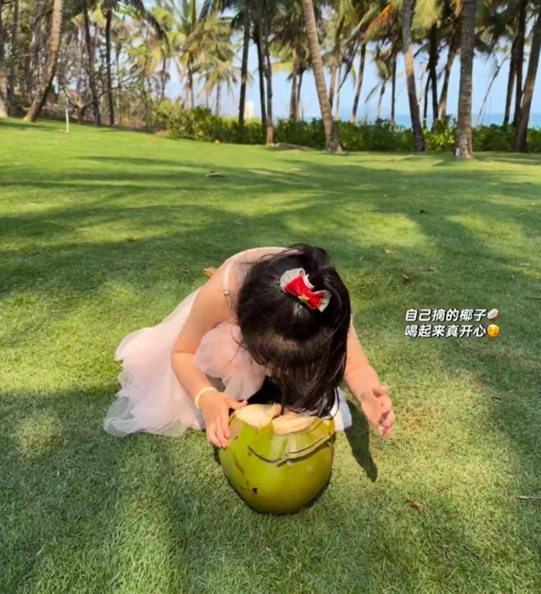 她的怀里抱着一个已经被劈开的大青椰子,正专注地看着椰壳内部,似乎对里面的椰汁充满了兴趣。她的长发用一个红白相间的发饰束起,手腕上戴着一个淡黄色的手环。 宣云在照片描述中写道,这个椰子是女儿自己摘下来的。
