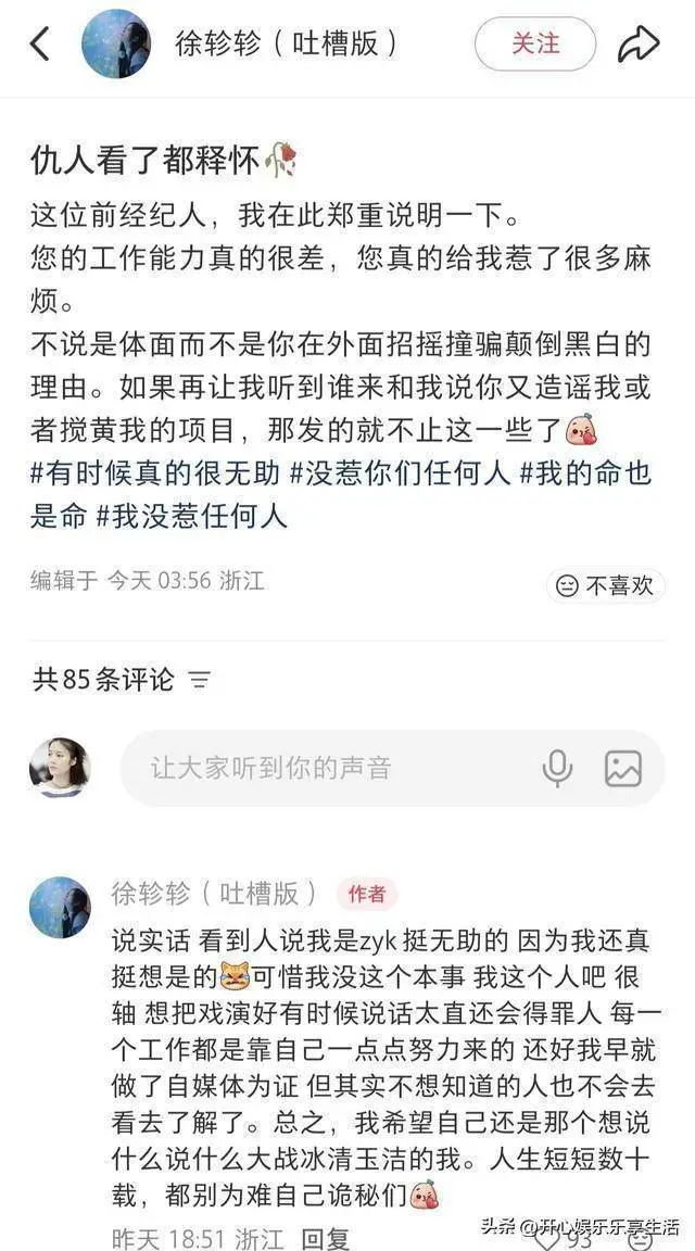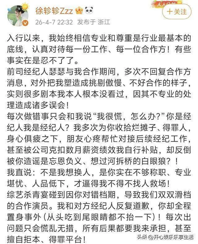 2026年4月7日晚,曾出演过《半熟老公》《婚后成瘾》《声声陷入》等短剧的女演员徐轸轸发长文并配上聊天记录手撕前经纪人,列举出多条其恶劣行为。