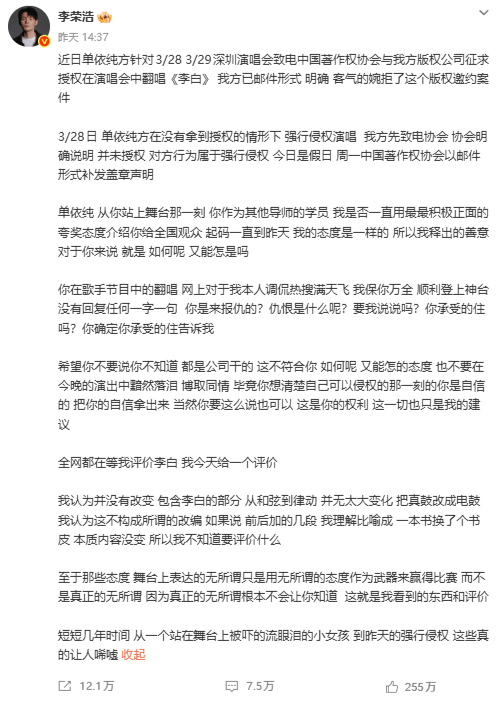 但李荣浩不一样,他没授权单依纯在演唱会上唱《李白》,结果人家还是翻唱了。他要维权,公开声讨,然后被骂。