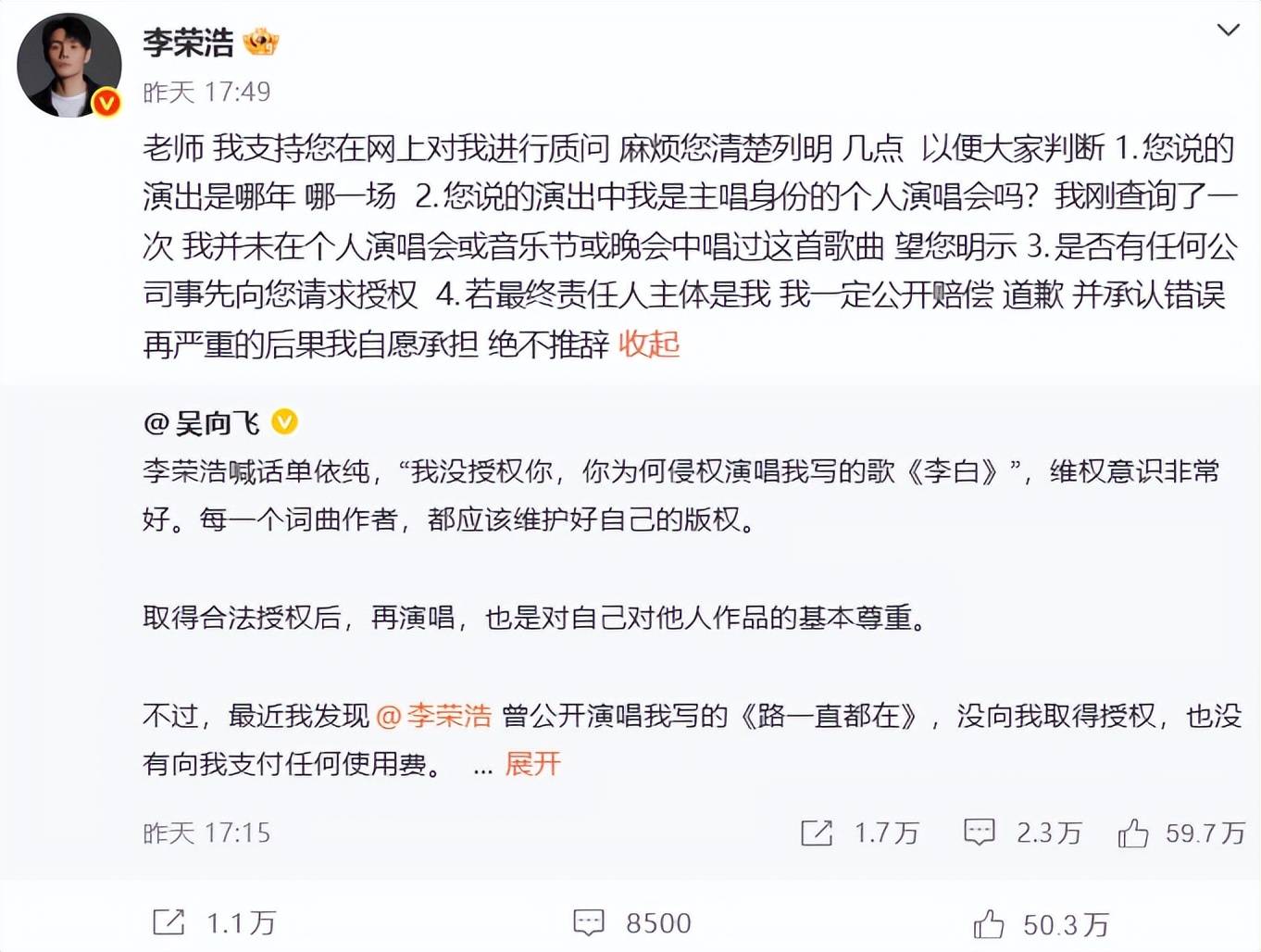 期间也有人表示李荣浩没经过自己授权就唱了他的歌,但李荣浩丝毫不虚: