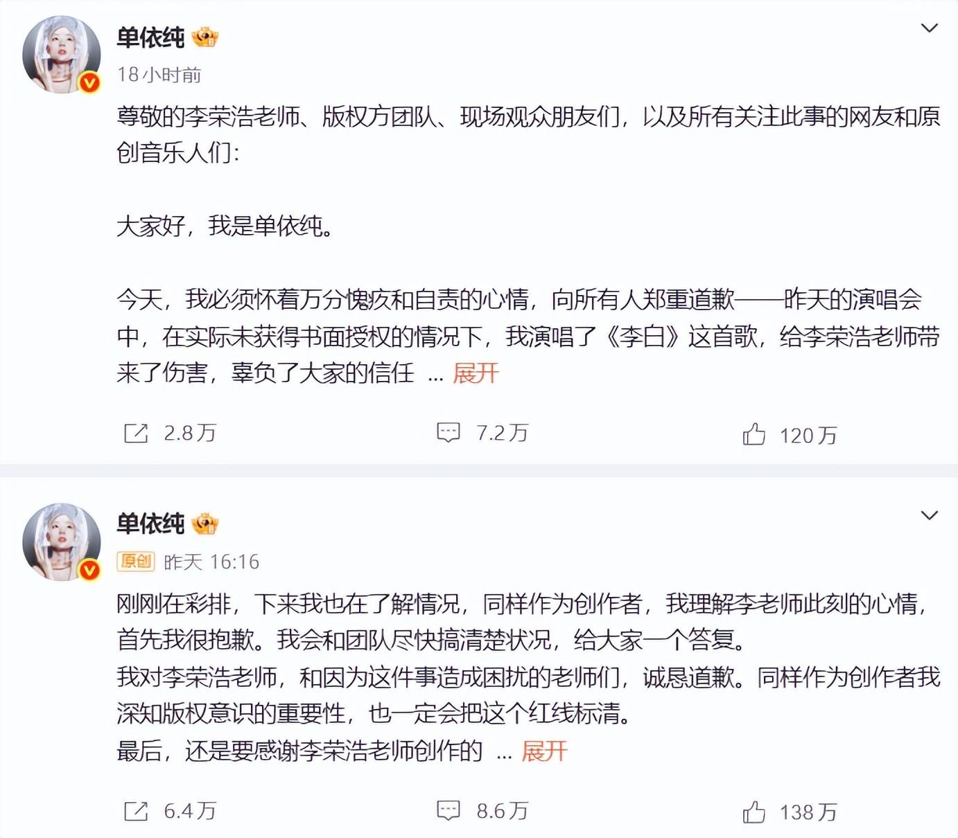 本日凌晨,单依纯在其个人社媒发长文道歉,她称此次巡演的曲目版权审核、授权申请等工作,均由主办公司全权负责,自己演出前未进一步核实授权文件细节,之后才得知主办方实际并未签署《李白》的表演授权。
