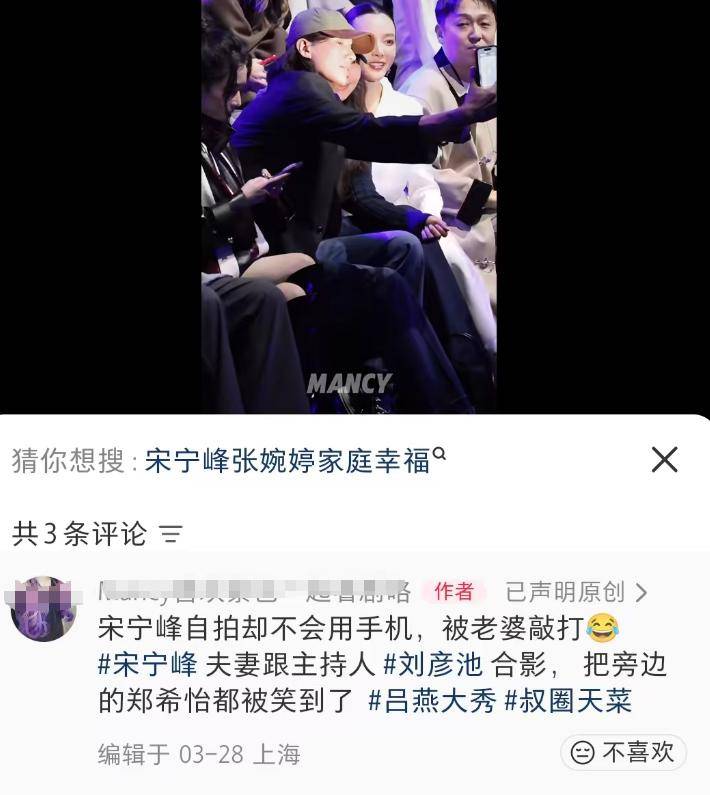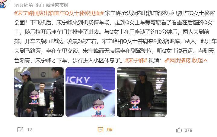 宋宁峰回应出轨之后,很快就被狗仔打脸了,而且打脸还打得很彻底。狗仔曝出他在道歉信前一晚,还在和Q女士会面。两人在公开场合没什么亲密举动,宋宁峰脸色阴沉,疑似是为了避嫌,和女