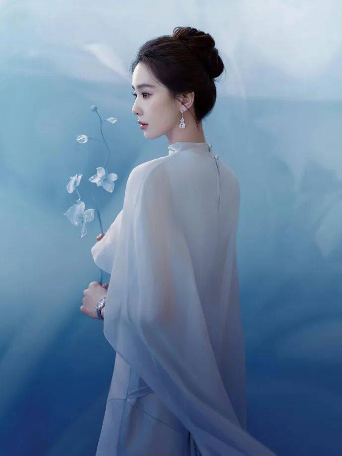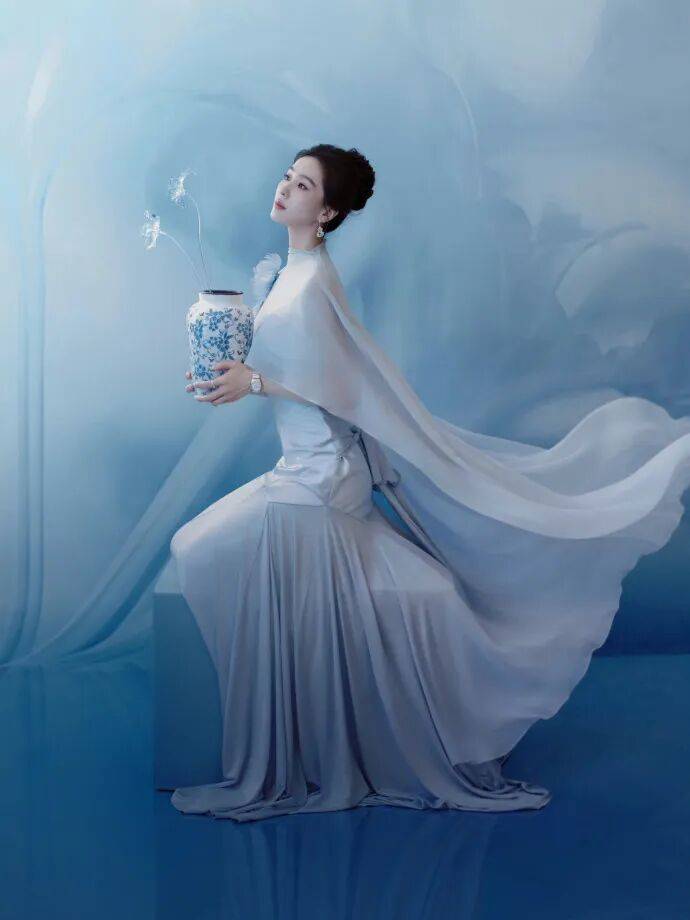 刘诗诗穿着浅蓝色薄纱礼裙,她俏脸清丽脱俗,长发盘起很有气质,她写真抱着青瓷,美得让人心动!