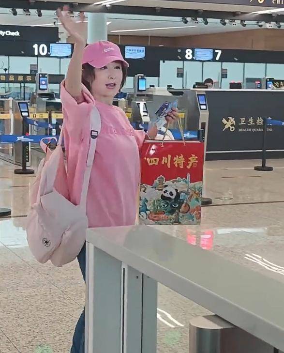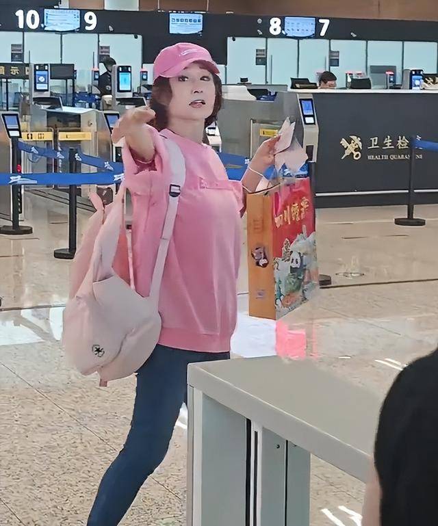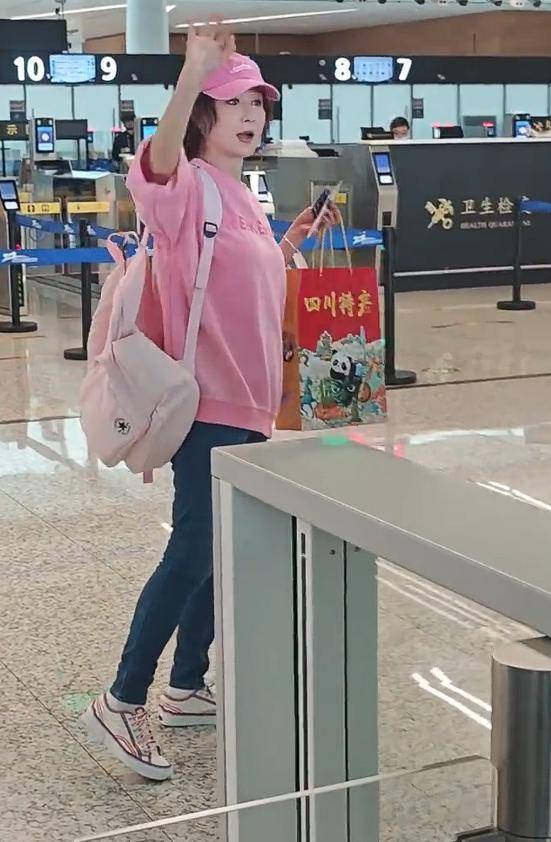 她穿了件粉色卫衣,搭配棒球帽和修身牛仔裤,背着一个简单的背包,独自行走在机场里。