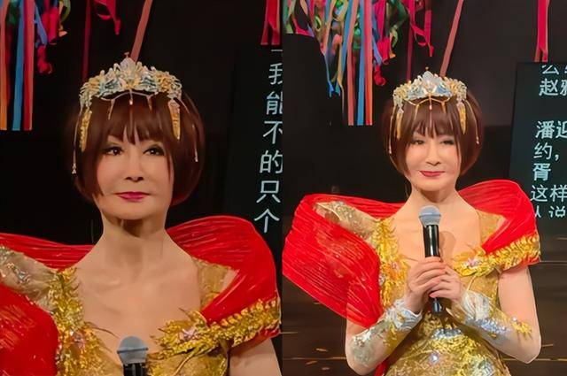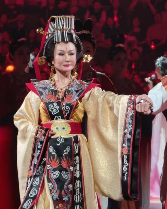 当聚光灯打向舞台中央,一位身披金红相间女皇装的老人缓缓走出,全场瞬间沸腾,那是潘迎紫。