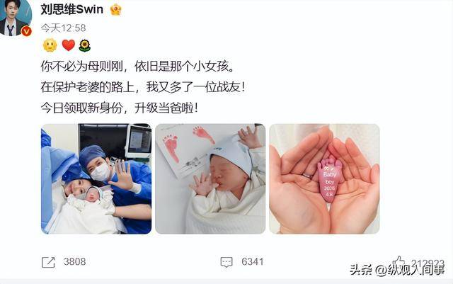 刘思维配文写道:“你不必为母则刚,依旧是那个小女孩。在保护老婆的路上,我又多了一位战友!今日领取新身份,升级当爸啦!”