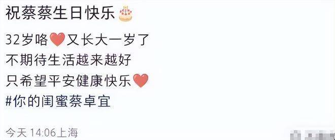 4月8日下午,大马歌手兼演员(Joey Chua)在社交网上传一则最新动态,俏皮配文称“祝蔡蔡(自己)生日快乐,32岁咯,又长大一岁了”,并tag上“爱心”“蛋糕”emoji表情符号,心情大好。