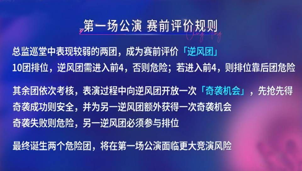 根据赛制,总监巡堂中表现较弱的孙怡团、乌兰图雅团成为“逆风团”,她们在其他团表演过程中有奇袭的机会,奇袭成功则安全,奇袭失败则危险待定。