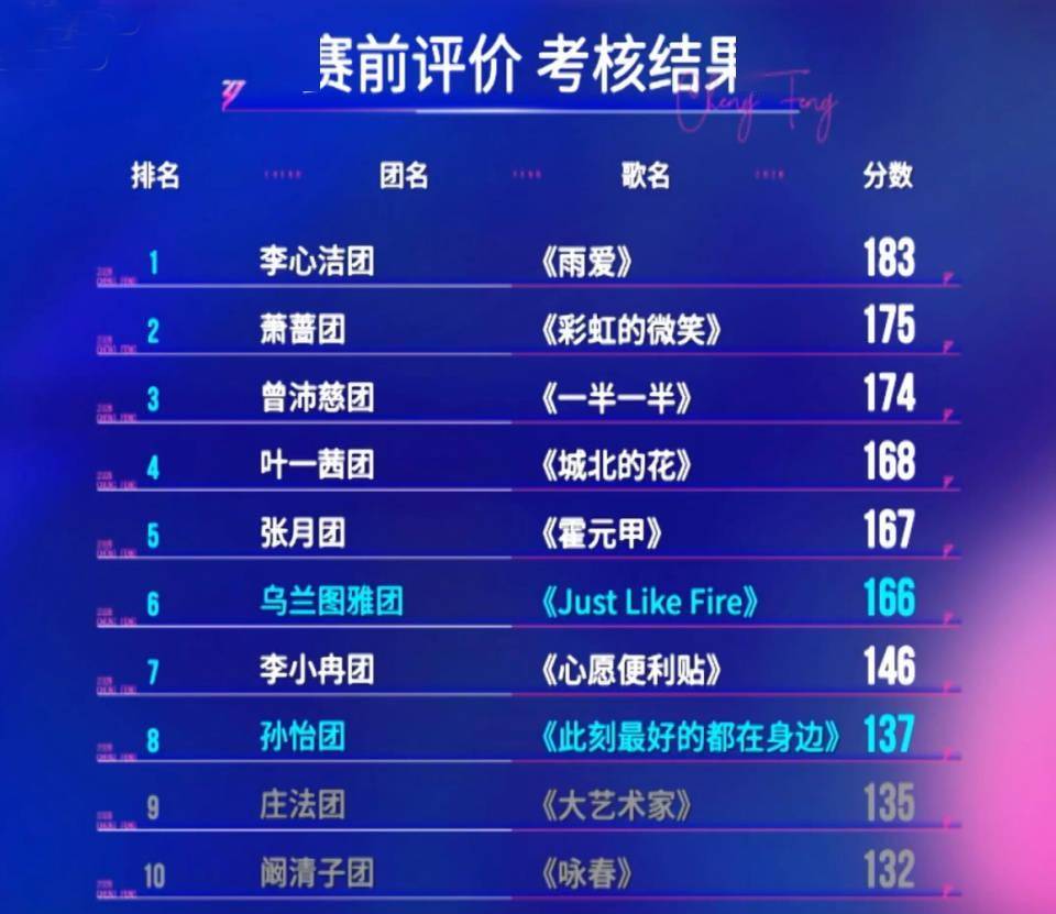 李心洁团考核的曲目是《雨爱》,全场听感最舒服的一个表演,全员都记住了歌词,姐姐们的声音交织在一起,达到了1+1大于2的效果,已经让人开始期待正式公演舞台姐姐们的表现了。李心洁团最终拿到183分,10个团中排名第一。