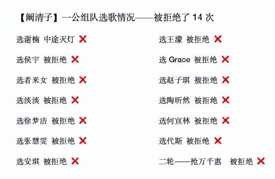 在一公分组选人环节,李小冉、曾沛慈等队长遭疯抢时,作为队长的阚清子一路遇冷。 据不完全统计,阚清子组队过程被拒绝了14次,包括王濛、侯宇、徐梦洁、张慧文、安崎等姐姐都拒绝了她。