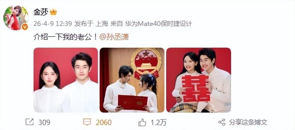 4月9日,歌手金莎在个人社交平台发文官宣与小18岁孙丞潇结婚的消息,真是恭喜恭喜了。说起来,金莎和孙丞潇已经交往很久了,去年孙丞潇还向金莎求婚成功,夫妻俩小两口终于喜结连理,确实是该好好恭喜他们啦。