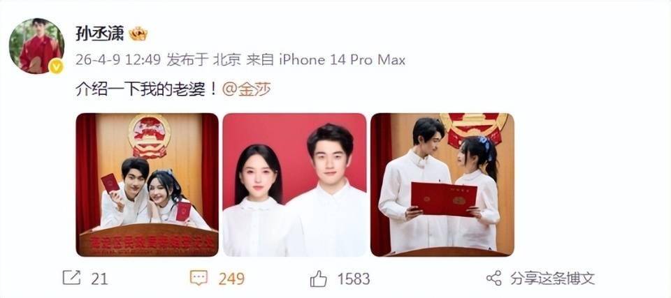 孙丞潇晒出了和金莎拿着结婚证拍照的甜蜜一幕,从他晒出的照片可以看到,夫妻二人是于2月13日领的证。如今趁着综艺节目开播,他们相继官宣,确实是格外的甜。