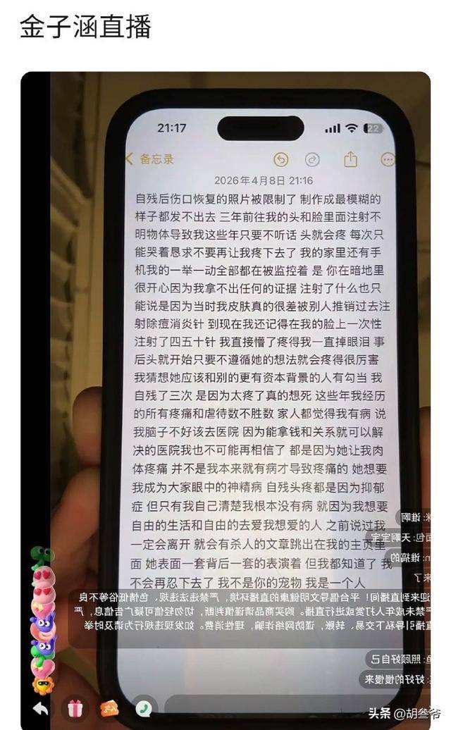 这场深夜直播,没有华丽的背景,没有多余的话语,金子涵只是一点点展示备忘录里的文字,把藏了三年的秘密摊在大众面前。