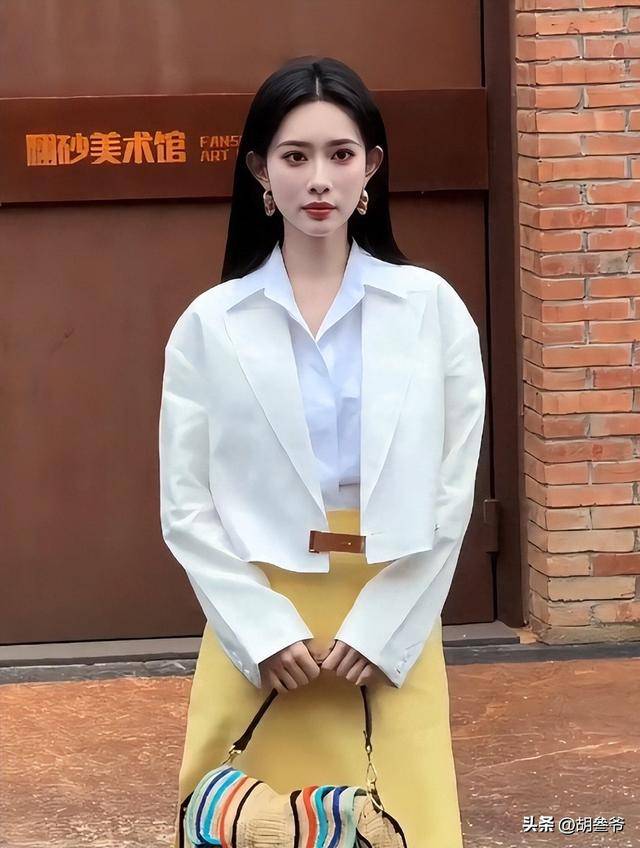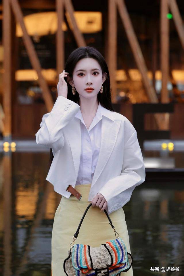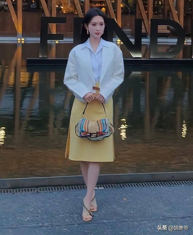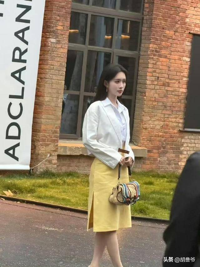 当天她一身白色短款西装内搭白衬衫,下身搭配明黄色高开叉半裙,手里拎着Fendi经典Peekaboo包袋,整套造型直接把都市精英感拉满。