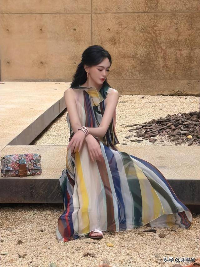 当天她身着彩色条纹无袖薄纱长裙,搭配半扎发造型,整体造型轻盈飘逸,自带仙气。