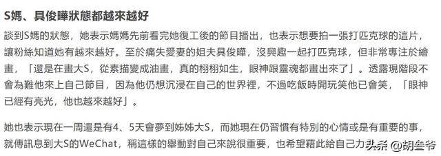 不过小S也说,姐夫的状态慢慢在变好了,聚餐的时候她偶尔开玩笑,具俊晔眼睛里开始有光,也能笑得出来,不再是之前那种全程沉默、眼神空洞的样子。