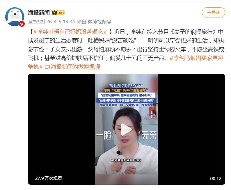 据4月10日报道,演员李纯在综艺《妻子的浪漫旅行》里的一番吐槽,直接戳中了不少年轻人的心窝子。她直言妈妈是“没苦硬吃”——明明子女有能力让生活更舒