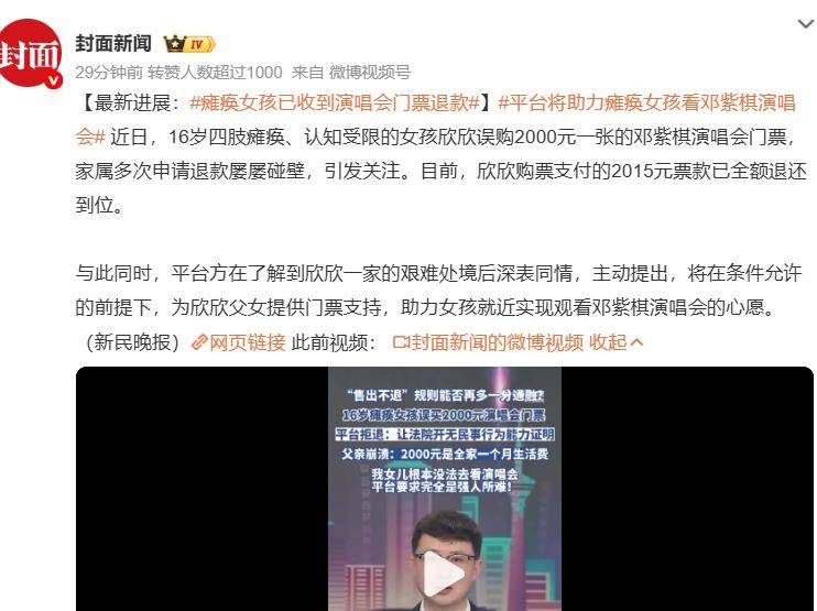 不仅如此,平台在了解到邓紫棋的歌声曾是欣欣车祸昏迷期间的重要精神慰藉、现场观看演唱会是女孩“藏在心里很久的心愿”后,进一步表达了善意:他们主动提出,将在条件允许的前提下,为欣欣父女提供门票支持,助力女孩就近实现观看邓紫棋演唱会的心愿。欧阳先生表示,退款到账后,女儿得知有可能圆梦现场,感到“特别开心”。