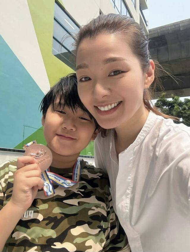 小家伙长高不少,面对镜头露出开心的笑容,他的脖子上挂了奖牌,合照时还特地依偎在妈妈的肩头并且高举奖牌,想来也是有种自豪感。
