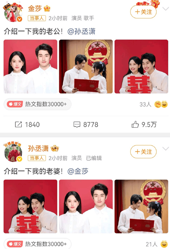 2026年4月9日,晒结婚照官宣领证,微博互动"介绍老公/老婆"。