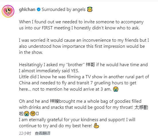 陈凯琳用英文写道:“当得知需要邀请一位朋友陪同参加初舞台时,我真的不知道该找谁。我担心会给朋友添麻烦,却也明白第一印象对节目有多重要。我犹豫了很久,才问祥哥是否有空,他几乎立刻就答应了。我完全没想到他当时正在内地另一个偏远地区录节目,需要坐飞机再转机,耗时7小时才能赶到这里……更别说他凌晨3点才抵达。对了,他和祥嫂还为我带了一大包对嗓子有益的饮品和零食!我永远感激你们的善意与支持!我会继续努力,做到最好!”