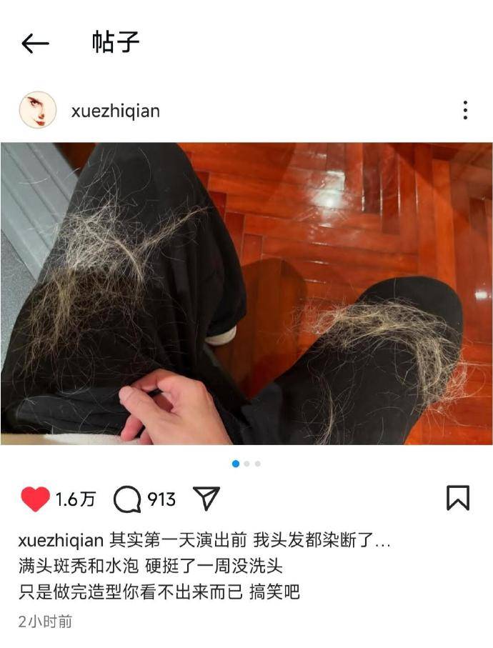 他自己晒图、自己发文,说得也很直接:头发染断了,头上还有水泡,很痒,硬挺了一周没洗头,做完造型后外界看不出来。