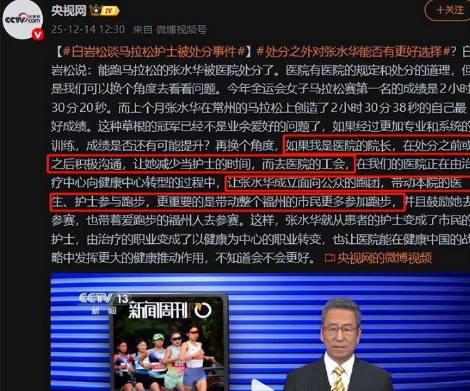 在张水华护士的事件里,他又一次与现实脱节,当事人通过伪造休假去参加马拉松、接受商业代言,将繁重的工作交给了同事,结果被医院处罚。