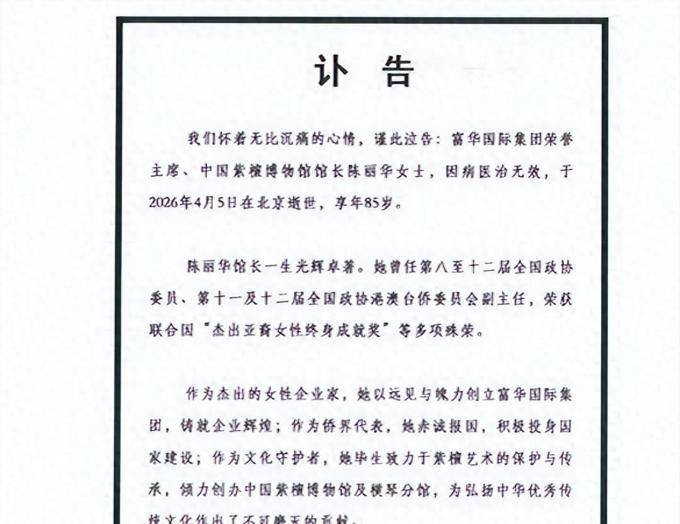2026年4月7日,富华国际集团发布讣告:集团荣誉主席、中国紫檀博物馆馆长陈丽华女士因病医治无效,于4月5日在北京逝世,享年85岁。