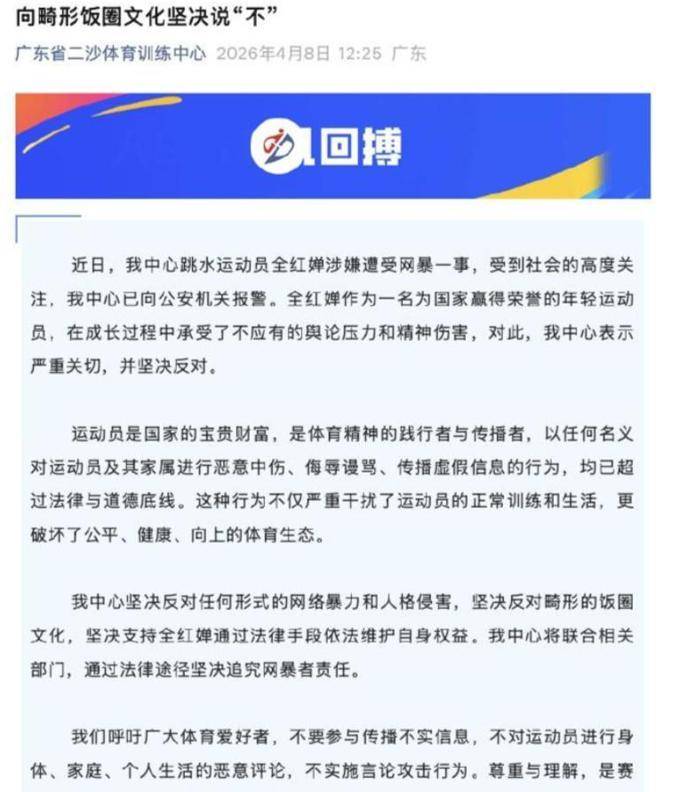 2026年4月8日,广东省二沙体育训练中心正式发布了一份声明,宣布已经向警方报案,