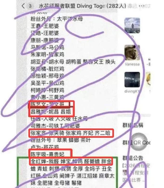 群中还编造了许多不太好听的昵称,如“醛悼蟾”、“胖金蟾”、“全山鸡”和“全母猪”,这些都听起来非常刺耳,