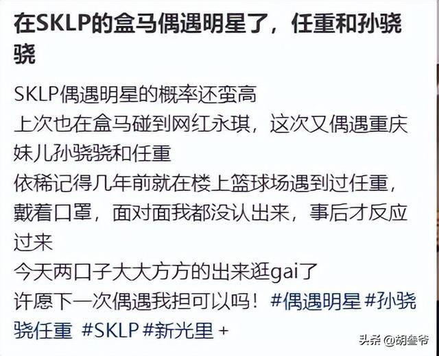4月9日,多位网友在重庆SKLP商场的盒马超市撞见了任重和孙骁骁。