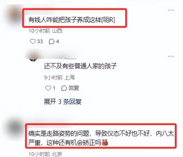有网友评论说:“看刘芸平时就很紧张,孩子长期在这样的环境里,肯定也放不开”,还有网友说:“内八和抽动症都是可以干预的,希望郑钧和刘芸能多关注孩子的心理和身体,别再忽视这些小问题了”。