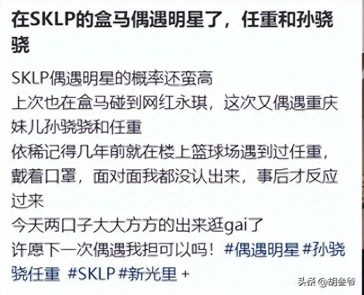 4月9日,多位网友在重庆SKLP商场的盒马超市撞见了任重和孙骁骁。