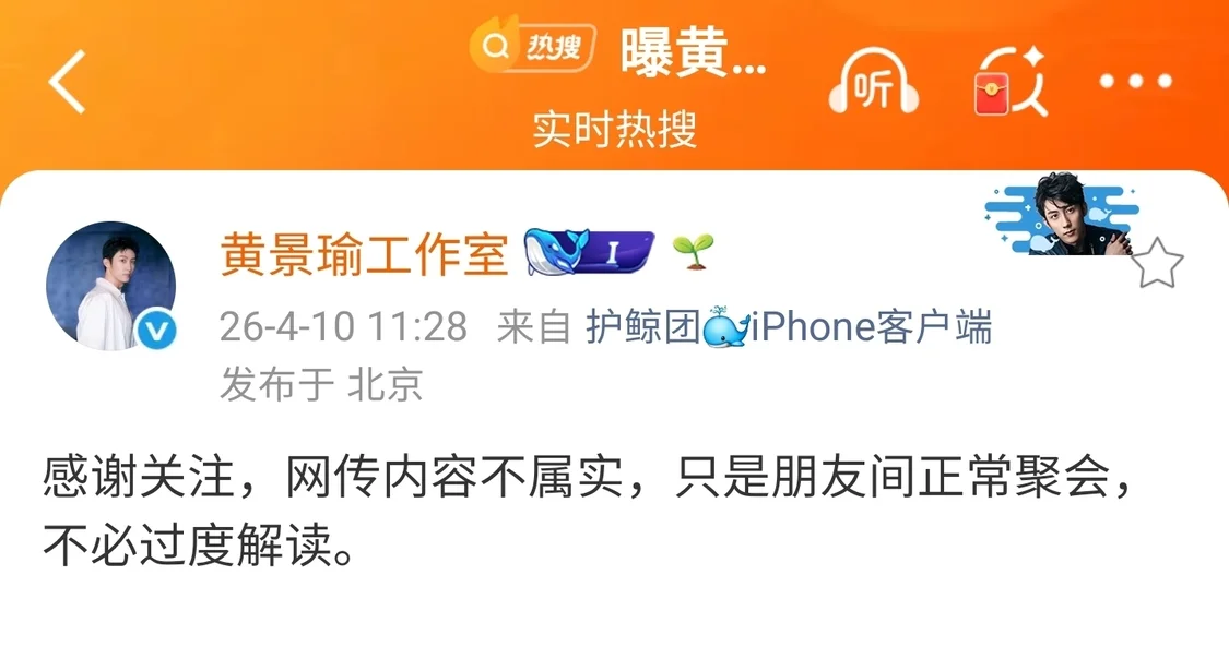 结果黄景瑜工作室直接光速下场,11点28分就发声明:“网传内容不属实,只是朋友间正常聚会,不必过度解读”。