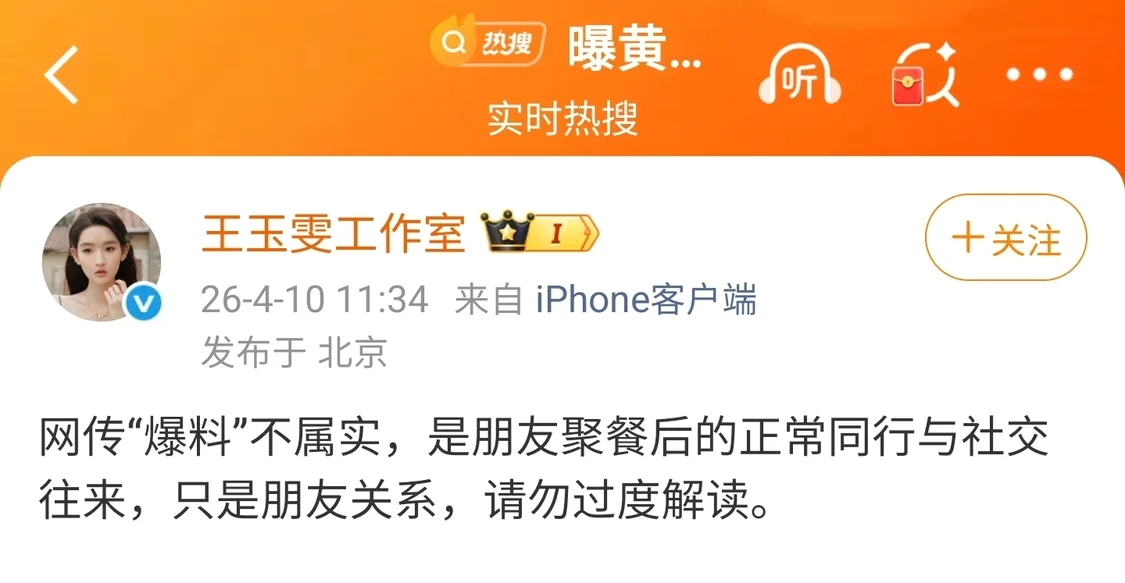 紧接着王玉雯工作室也跟上,11点34分直接盖章:“网传爆料不属实,是朋友聚餐后的正常同行与社交往来,只是朋友关系,请勿过度解读”。