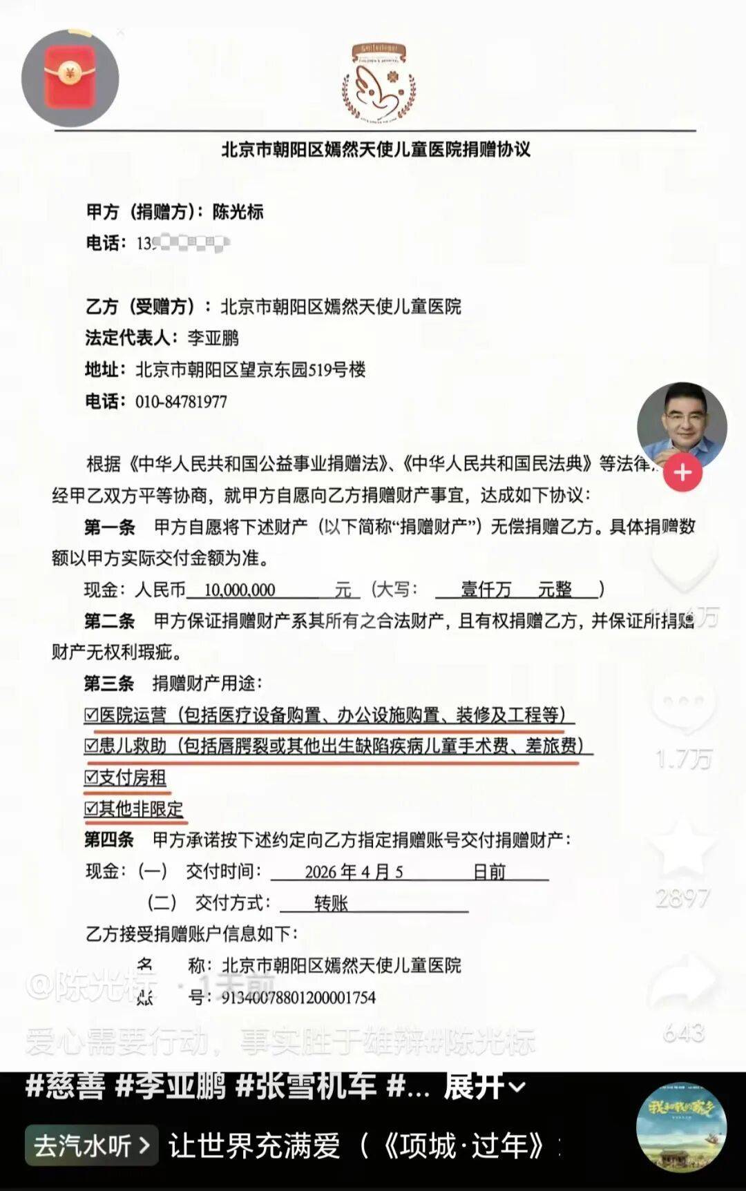 此前一天,陈光标在社交平台曾公布向嫣然儿童医院捐款的具体使用范围。捐赠协议第三条“捐赠财产用途”包括四项:可用于医院运营(包括医疗设备购置、办公设施购置、装修及工程等)、患儿救助(包括唇腭裂或其他出生缺陷疾病儿童手术费、差旅费)、支付房租及其他非限定性支出。