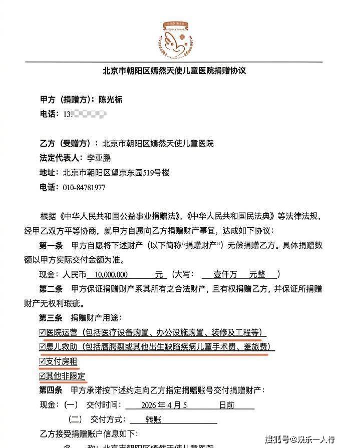 面对这些声音,陈光标在4月8号,也就是李亚鹏直播澄清的前一天,直接晒出了《捐赠协议》的关键部分。协议白纸黑字,第三条“捐赠财产用途”里写得清清楚楚:这笔钱可以用于“医院运营、患儿救助、支付房租及其他非限定性支出”。这几乎涵盖了医院所有主要的开销方向。陈光标后来在接受采访时说得更直白:“我跟亚鹏说得非常清楚,这笔钱可以买设备,可以建房子,可以修病房,可以作房租,也可以直接补贴手术费,只要切实帮助到嫣然的生存和发展,怎么有效怎么用。”他还特别强调,“我不需要医院在墙上挂我的名字,我需要的是那间手术室能多做一些手术、多几个孩子能早一天做上手术。”