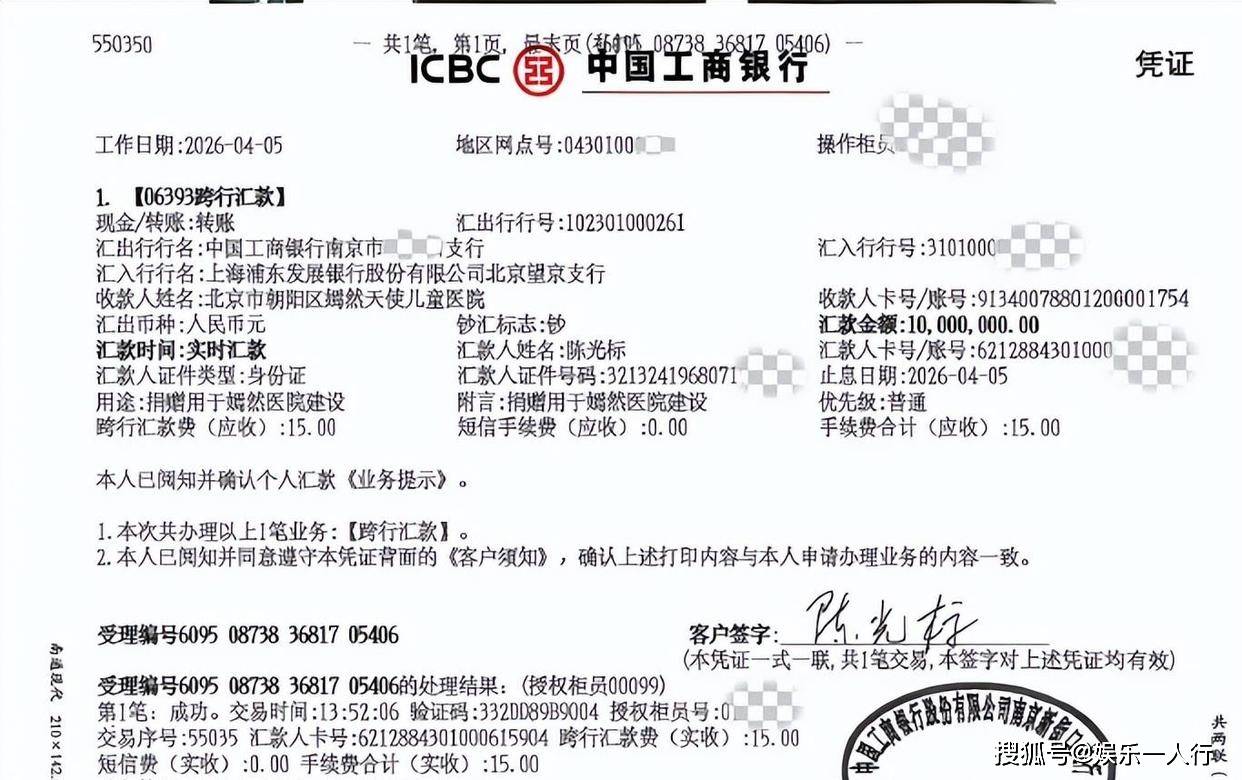事情的高潮在4月5号。陈光标在朋友圈晒了图,说“鉴于张雪先生迟迟未来见面提车,现在我充分尊重张先生的意愿,特此前来将车辆变现的资金捐赠给嫣然医院。”他晒出的银行汇款单显示,收款方是“北京市朝阳区嫣然天使儿童医院”,金额是1000万元,附言写着“捐赠用于嫣然医院建设”。一辆传说中的1300万豪车,变现成了1000万现金,汇进了一家儿童医院的账户。数字的变化本身就充满了议论空间。